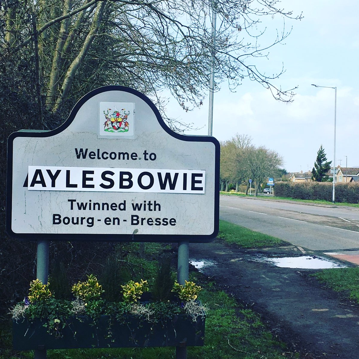 If you’re local you may have seen the publicity stunt around the town yesterday. All over Aylesbury, the town boundary signs were changed to “Aylesbowie” to raise awareness of the launch of the statue, a gesture that made me and kids laugh a lot. It’s worked though as everyone is talking about it! One of children is hoping that the name change is permanent because it sounds more interesting!